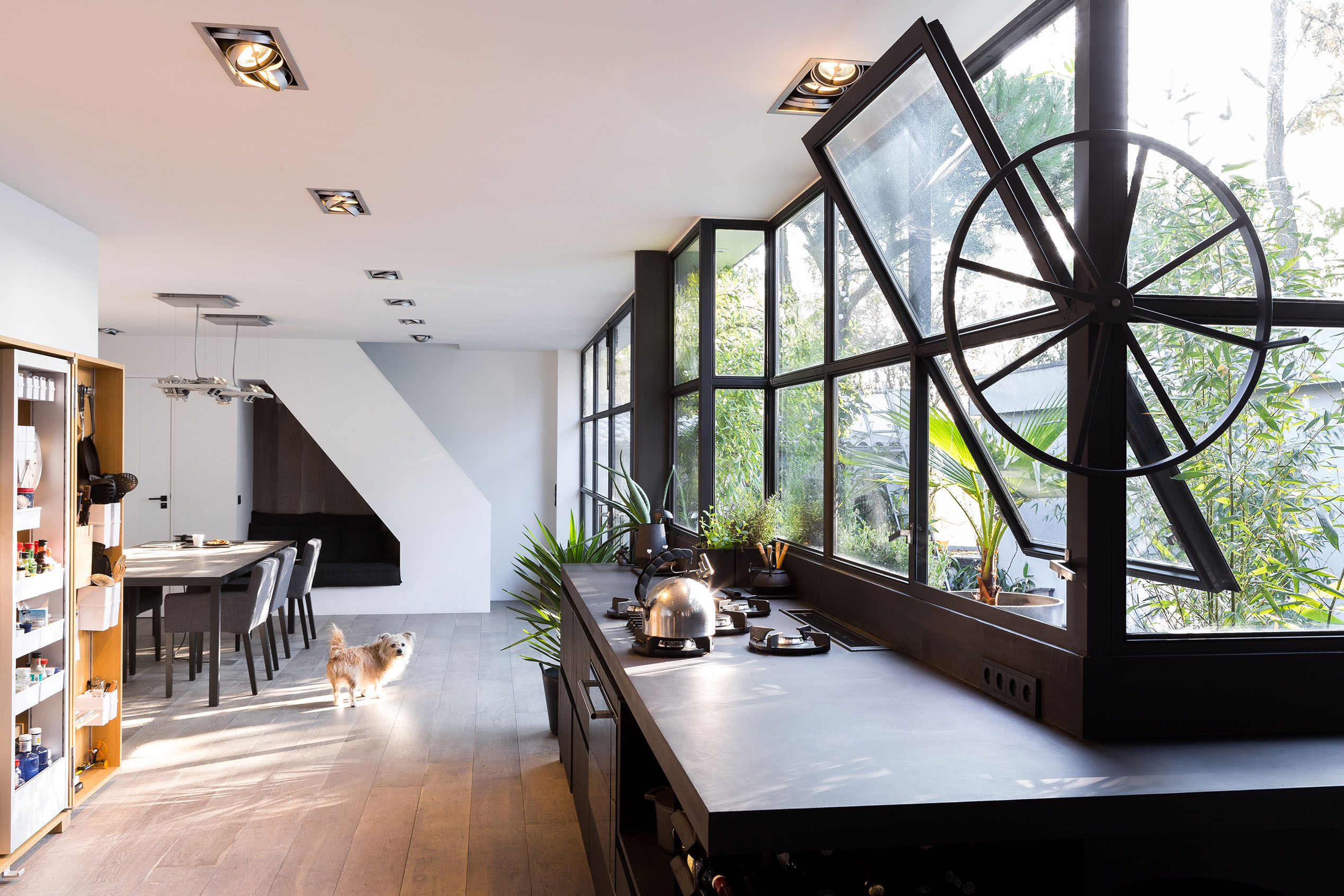 De woning kent van binnen een volledig industriële interieur, waarbij alle stalen- kozijnen en details, waaronder het wiel om het raam in de keuken open te draaien, dit direct onderstrepen. De houten vloer is overal doorgetrokken wat alles tot één geheel maakt.